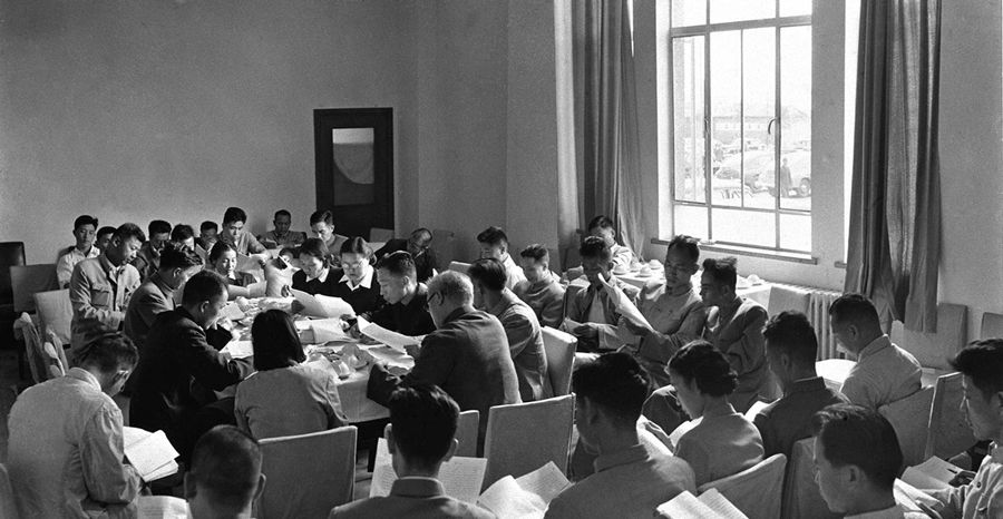 参加大会的代表在小组会上讨论大会的报告。新华社图片