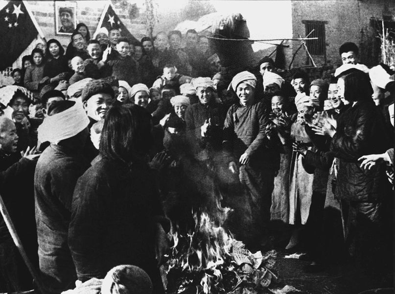 土地改革中湖南岳阳县策口乡农民烧毁旧地契。 新华社图片